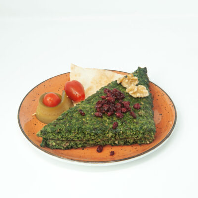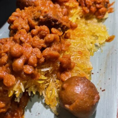 Fine crispy crust of rice served with Ghorme sabzi, Ghaimeh or Fesenjoon stew