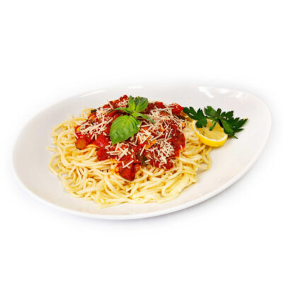 Spaghetti with tomato, mushroom, zucchini, onion, peppers, herbs and spice