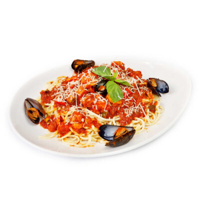 Spaghetti with shrimp, oyster, tomato, mushroom, zucchini, onion, peppers, herbs and spice